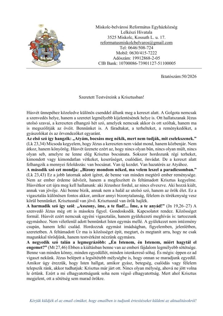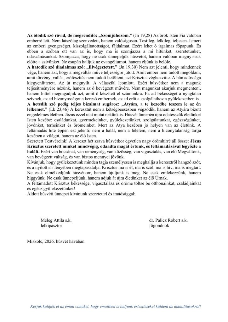 Gyülekezetünk 2026. évi húsvéti körlevele Szerző: Zsuzsa Dátum: 2026. április 1. Kategória: Hirdetések Előző 2026. áprilisi programok
